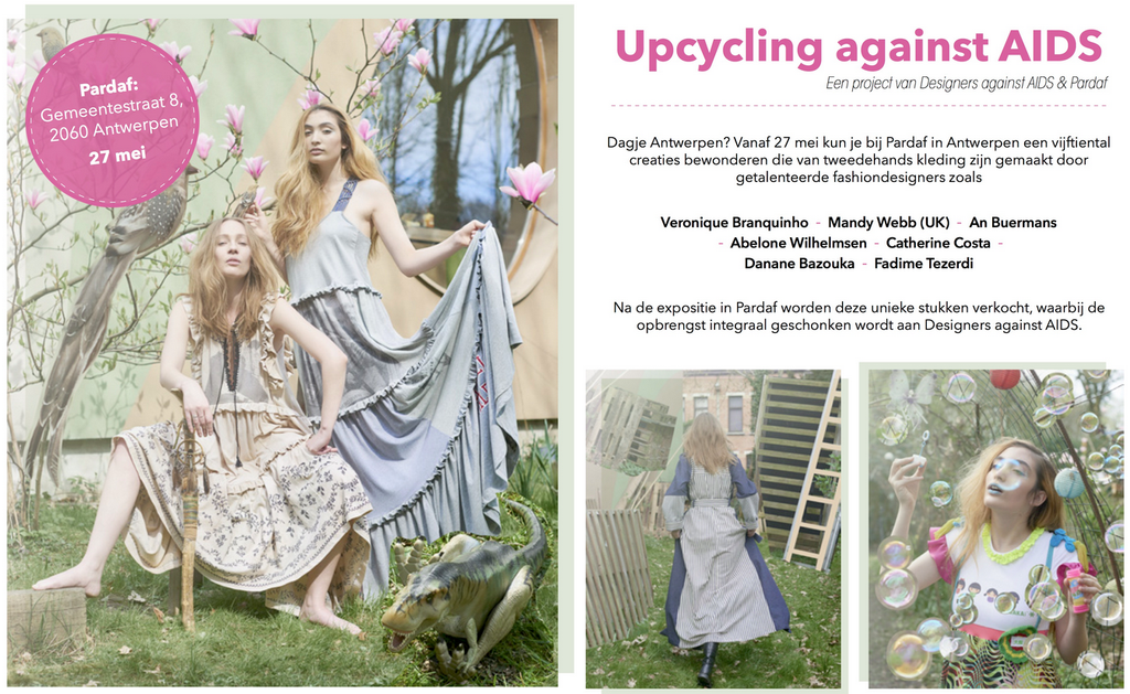 An expo from Designers Against Aids and 15 Belgium designers. These unique pieces will be for sale during 27May till 9 June. The profites go's all to the good aim: Designers Against Aids. The design clothing is all made of secondhand clothing of Pardaf, Antwerp.